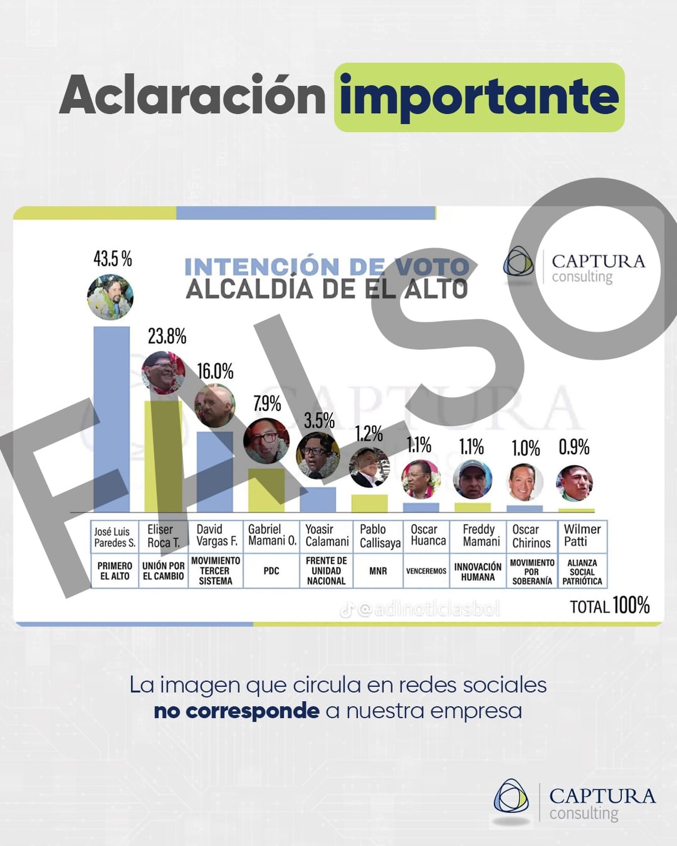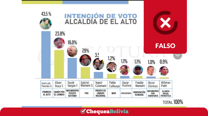 En TikTok circula una imagen con resultados de intención de voto para la alcaldía de la ciudad de El Alto, supuestamente elaborado por la empresa Captura Consulting, que da como ganador al candidato, José Luis Paredes, de la organización política Primero El Alto. ChequeaBolivia advierte que se trata de un contenido falso.