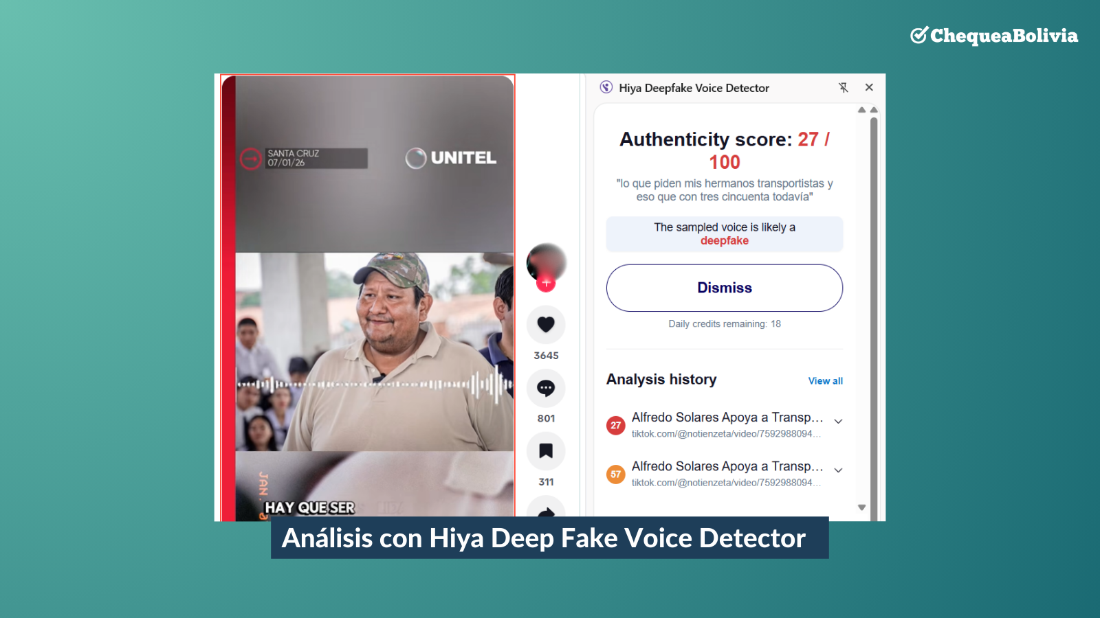 Adicionalmente, ChequeaBolivia pasó el audio atribuido a Solares por la herramienta Hiya Deepfake Voice Detector, que permite saber si un audio contiene inteligencia artificial.