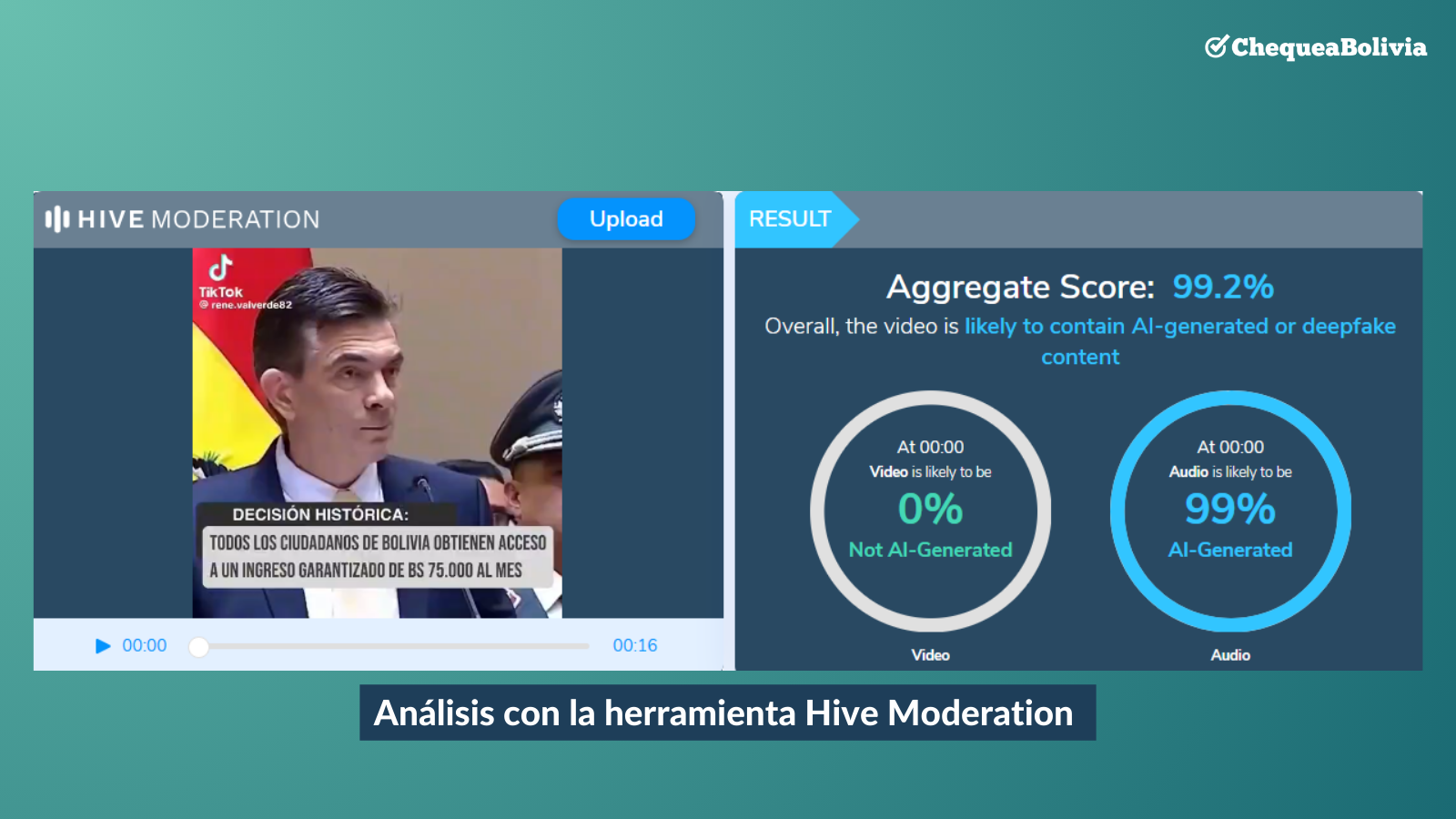Adicionalmente, ChequeaBolivia puso el video en la herramienta de detección de inteligencia artificial Hive Moderation, dónde obtuvo un puntaje de 99 por ciento de probabilidad de haber sido generado con Inteligencia Artificial.