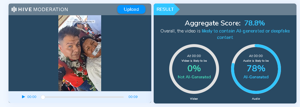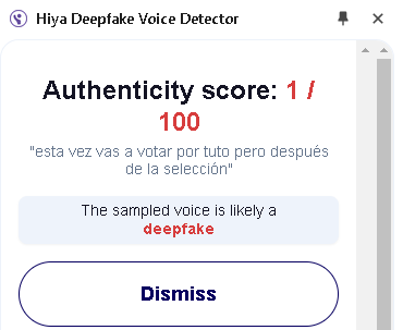 Se hizo uso de la herramienta de verificación Hive Moderation y los resultados obtenidos del clip fueron de 78 por ciento de probabilidad de uso de Inteligencia Artificial. También, se veríficó el audio en la herramienta Hiya Deepfake Voice Detector, que identificó altas probabilidades de haber sido creado con IA.