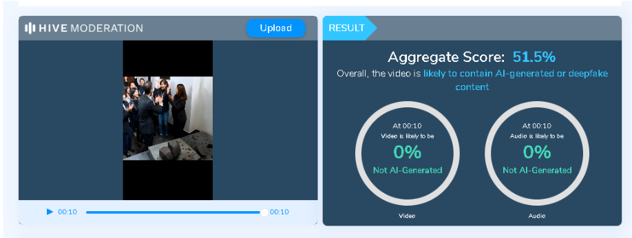 Según la herramienta de verificación Hive Moderation existe un 51.5 por ciento de probabilidad de uso de Inteligencia Artificial (IA) y en video en TikTok lleva la etiqueta de contenido generado con IA.