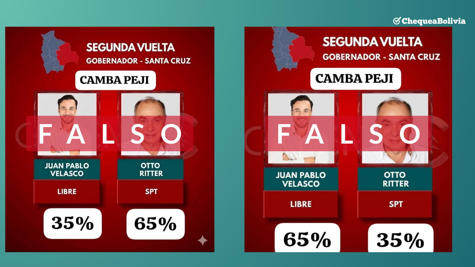 No es la primera vez que circula este contenido manipulado. ChequeaBolivia ya verificó anteriormente una imagen similar, pero con los resultados invertidos que favorecían a Velasco.