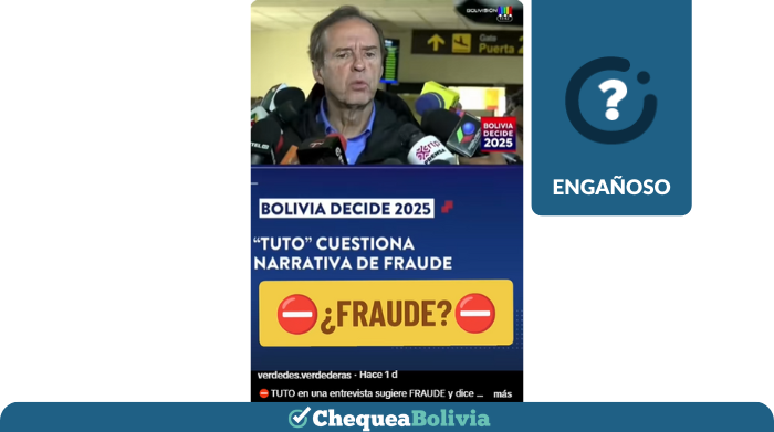 En TikTok circula un video donde el entonces candidato de Alianza Libre, Jorge Tuto Quiroga, denuncia "cosas muy raras" durante el proceso electoral y que el día anterior "surgió una denuncia de fraude", en referencia a la segunda vuelta electoral que enfrentó a Libre y el Partido Demócrata Cristiano (PDC). ChequeaBolivia verificó que el contenido es engañoso.