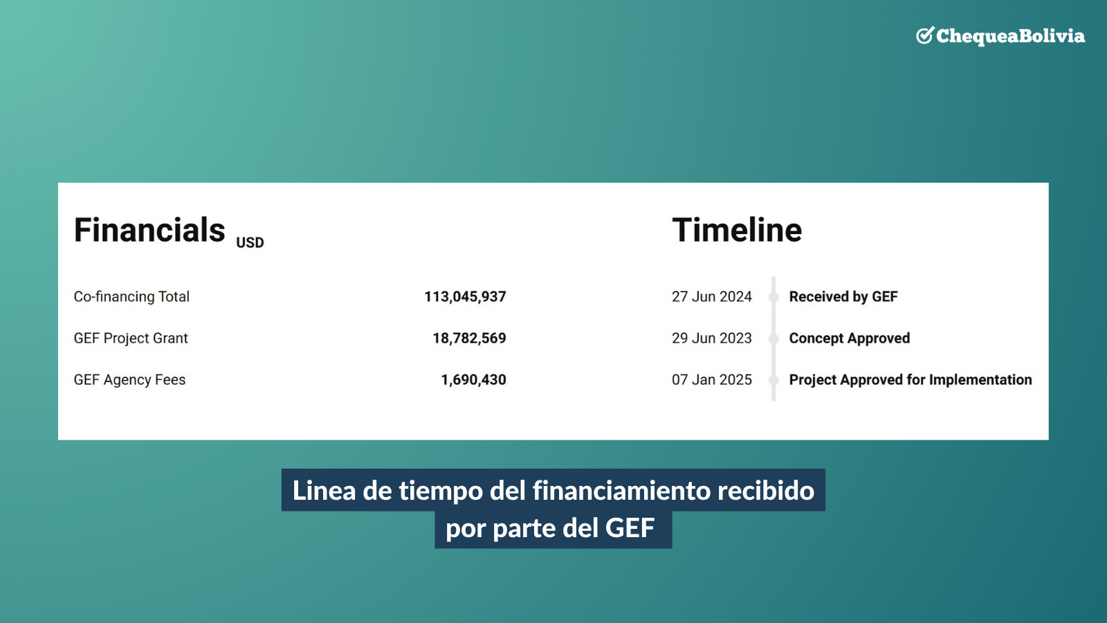 Según la página institucional del GEF, el concepto de proyecto fue enviado el 2023, la propuesta completa el 2024 y en junio de 2025 se inició su aplicación. Todo esto, durante la gestión de Luis Arce Catacora.
