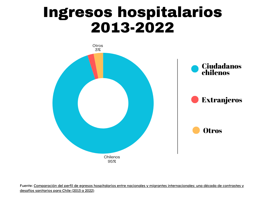 Además, según la investigación Comparación del perfil de egresos hospitalarios entre nacionales y migrantes internacionales 2013 a 2022, el 95 por ciento de los ingresos hospitalarios fueron de ciudadanos chilenos, y solo el 2 por ciento de extranjeros.