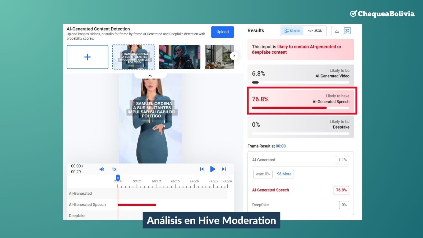 Adicionalmente ChequeaBolivia pasó el video por la herramienta de detección de Inteligencia Artificial Hive Moderation, que califica la probabilidad de que un contenido haya sido generado con esta tecnología.