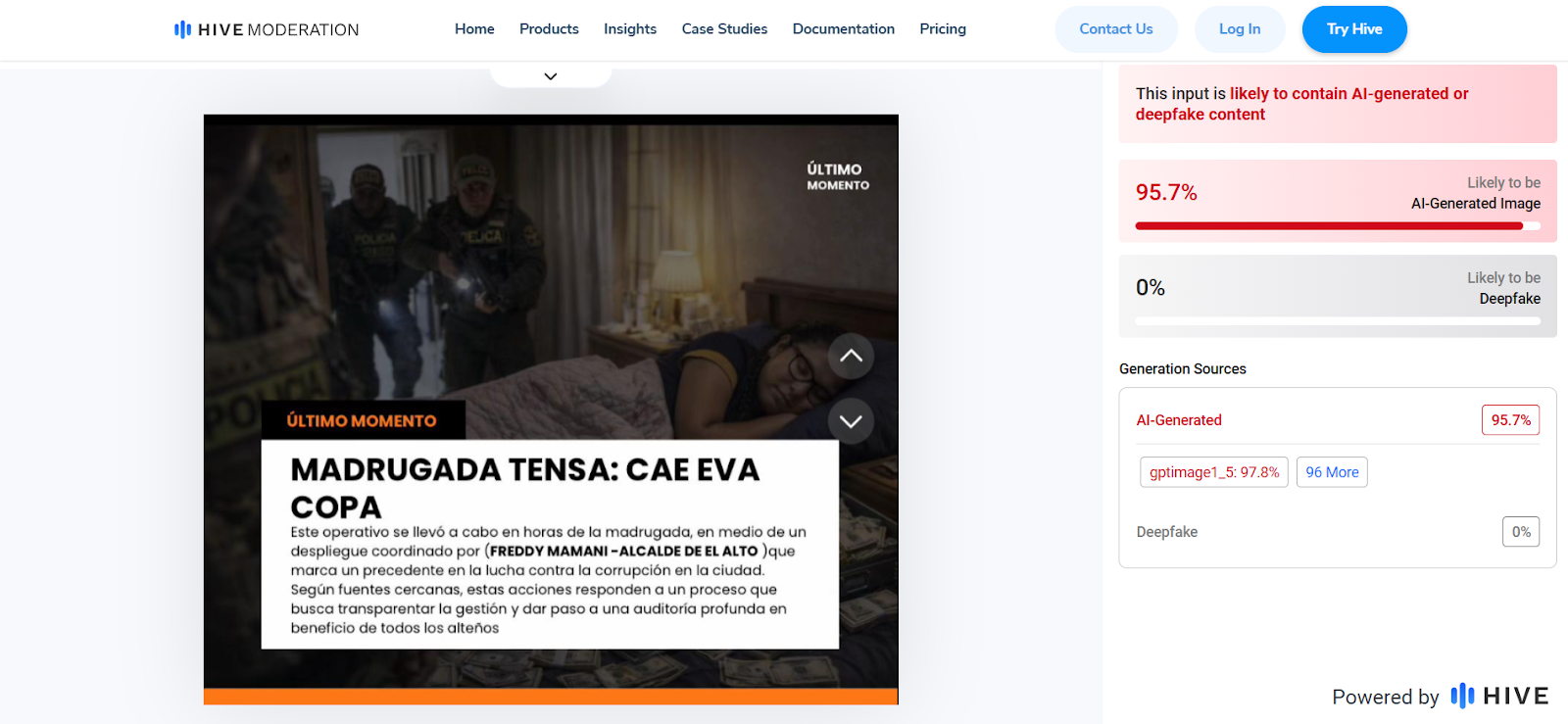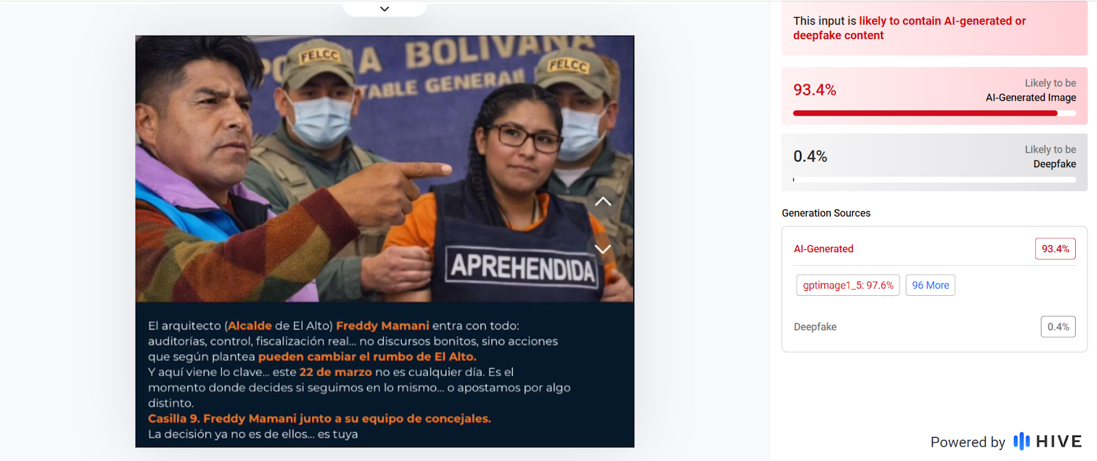ChequeaBolivia verificó el caso con la herramienta Hive Moderation, una herramienta especializada en detección de contenido generado o manipulado con IA. La misma presentó un 87 por ciento de probabilidad de que la primera imagen haya sido generada con IA, 95,7 por ciento de probabilidad para la segunda imagen y 93.4 por ciento de probabilidad para la tercera imagen.