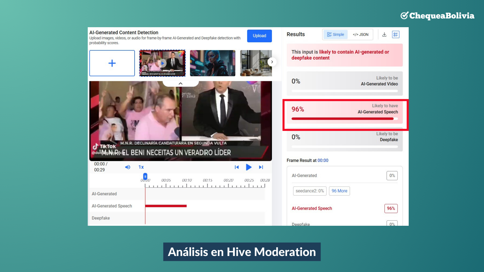 Nuestro equipo subió el video por la herramienta de detección de contenido generado por Inteligencia Artificial, Hive Moderation, y recibió un resultado de 96 por ciento de probabilidad de que el audio del video haya sido generado por esta tecnología.