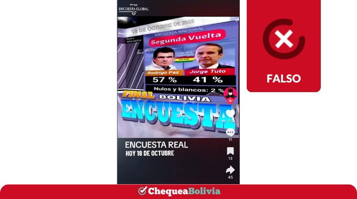 En TikTok circula una encuesta supuestamente publicada el 18 de octubre que posiciona al candidato presidencial por el Partido Demócrata Cristiano (PDC) Rodrigo Paz en primer lugar con un 57 por ciento de la intención de voto. ChequeaBolivia verificó que el contenido es falso.