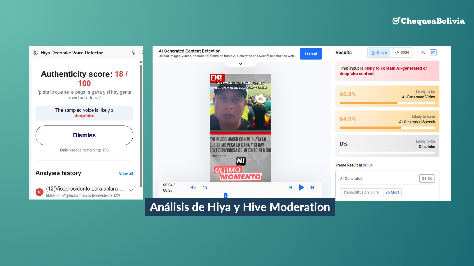 Adicionalmente ChequeaBolivia realizó un análisis con el detector de audios creados con inteligencia artificial Hiya Deepfake Voice Detector, recibiendo como resultados altas probabilidades de que este contenido sea una deepfake o contenido generado con IA.