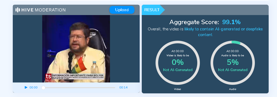 Nuestro equipo de verificación analizó los fragmentos de los videos utilizando herramientas especializadas en la detección de contenido manipulado con Inteligencia Artificial (IA): Hiya Deepfake Voice Detector y Hive Moderation. Los resultados determinaron que es altamente probable que los videos hayan sido generados mediante IA, como se muestra a continuación.