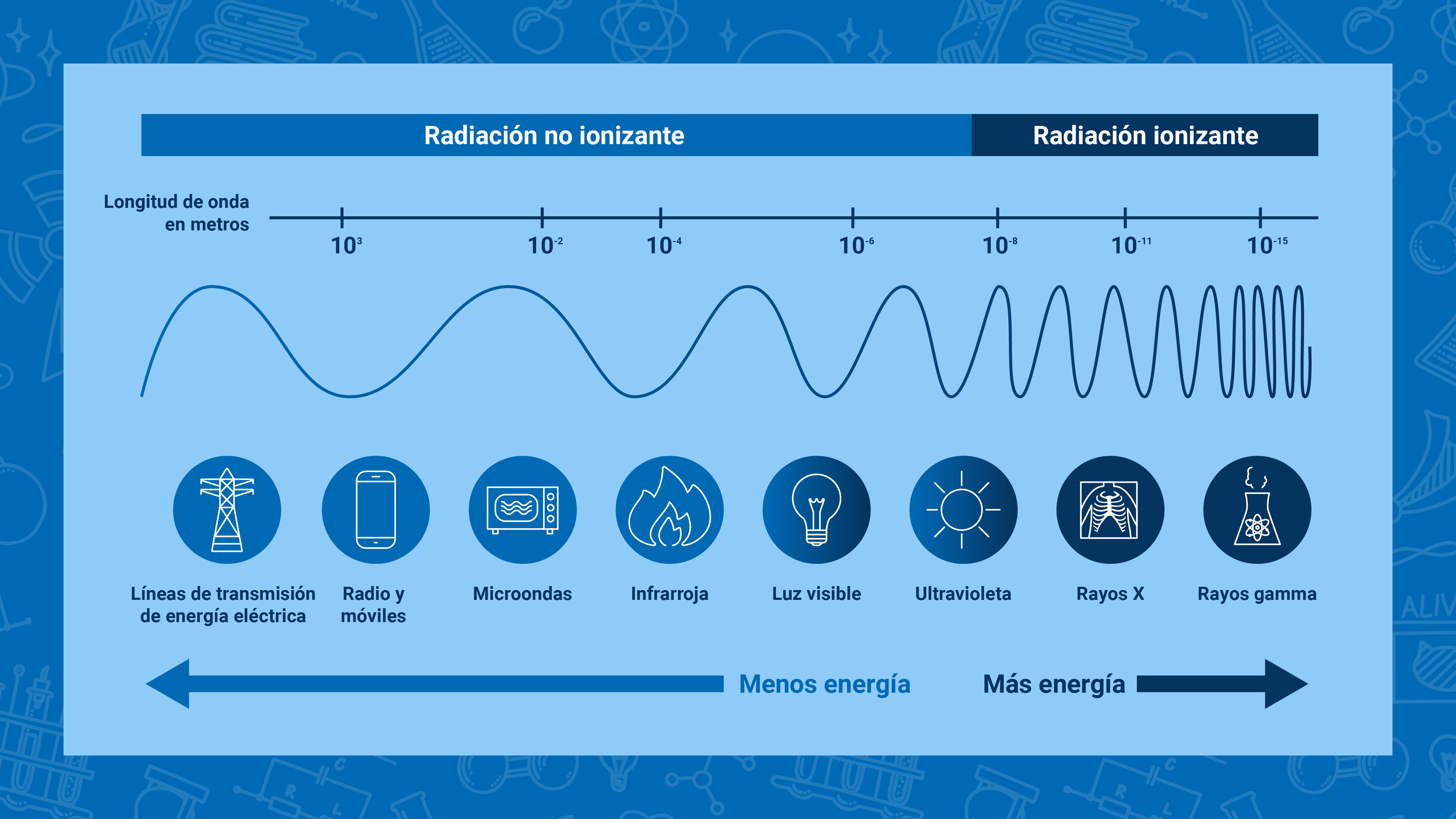 Mientras que la radiación ionizante puede cambiar la materia o los átomos de los seres vivos. Los rayos gamma, rayos x y algunos materiales que se usan en centrales nucleares emiten radiación ionizante.