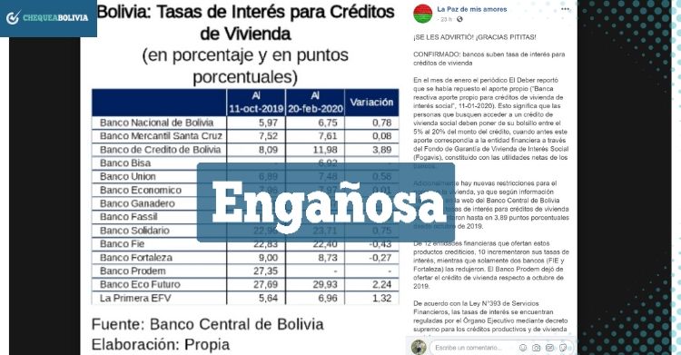 En las redes sociales se comparte un cuadro, con datos del Banco Central de Bolivia (BCB) sobre la fluctuación de las tasas de interés para créditos de vivienda entre octubre de 2019 y febrero de 2020, aseverando que existen incrementos en el sector de la banca. ChequeaBolivia verificó que se trata de información engañosa.
