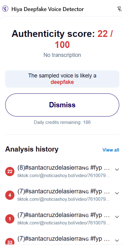Captura de los resultados de Hiya DeepFake Voice Detector.