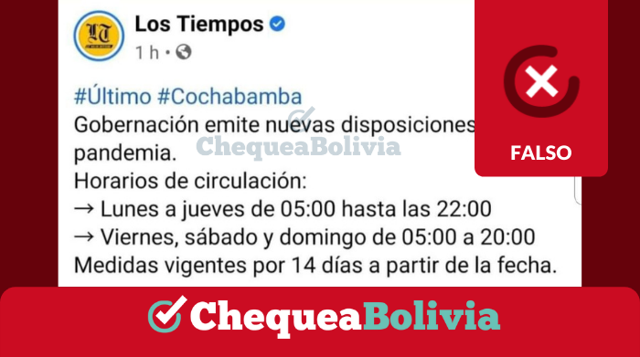 En WhatsApp circula una captura de una supuesta noticia de último momento del diario Los Tiempos con la siguiente información: “Gobernación emite nuevas disposiciones por la pandemia”. En la descripción se señalan ciertos horarios para la circulación de vehículos. ChequeaBolivia advierte que se trata de un contenido falso.