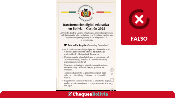 En WhatsApp circula una imagen anunciando una serie de medidas de la Ministra de Educación, Beatriz García, sobre una “transformación digital educativa en Bolivia”. ChequeaBolivia verificó que se trata de información falsa.