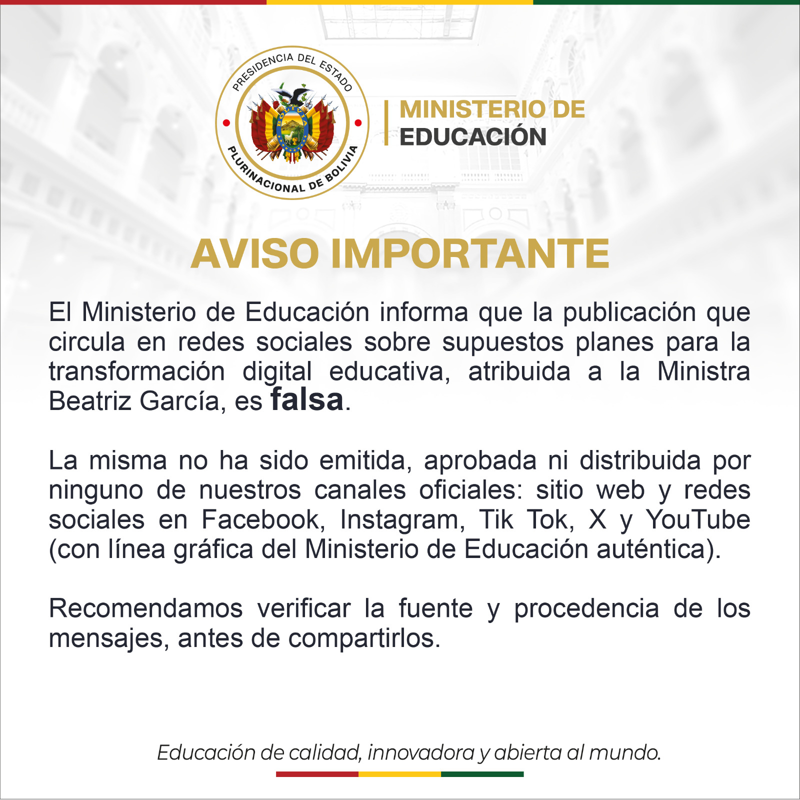 ChequeaBolivia se contactó con el número de WhatsApp del Ministerio de Educación para hacer la consulta. Ante esto, la institución publicó un comunicado señalando que la publicación sobre “planes para la transformación digital educativa es falsa”.