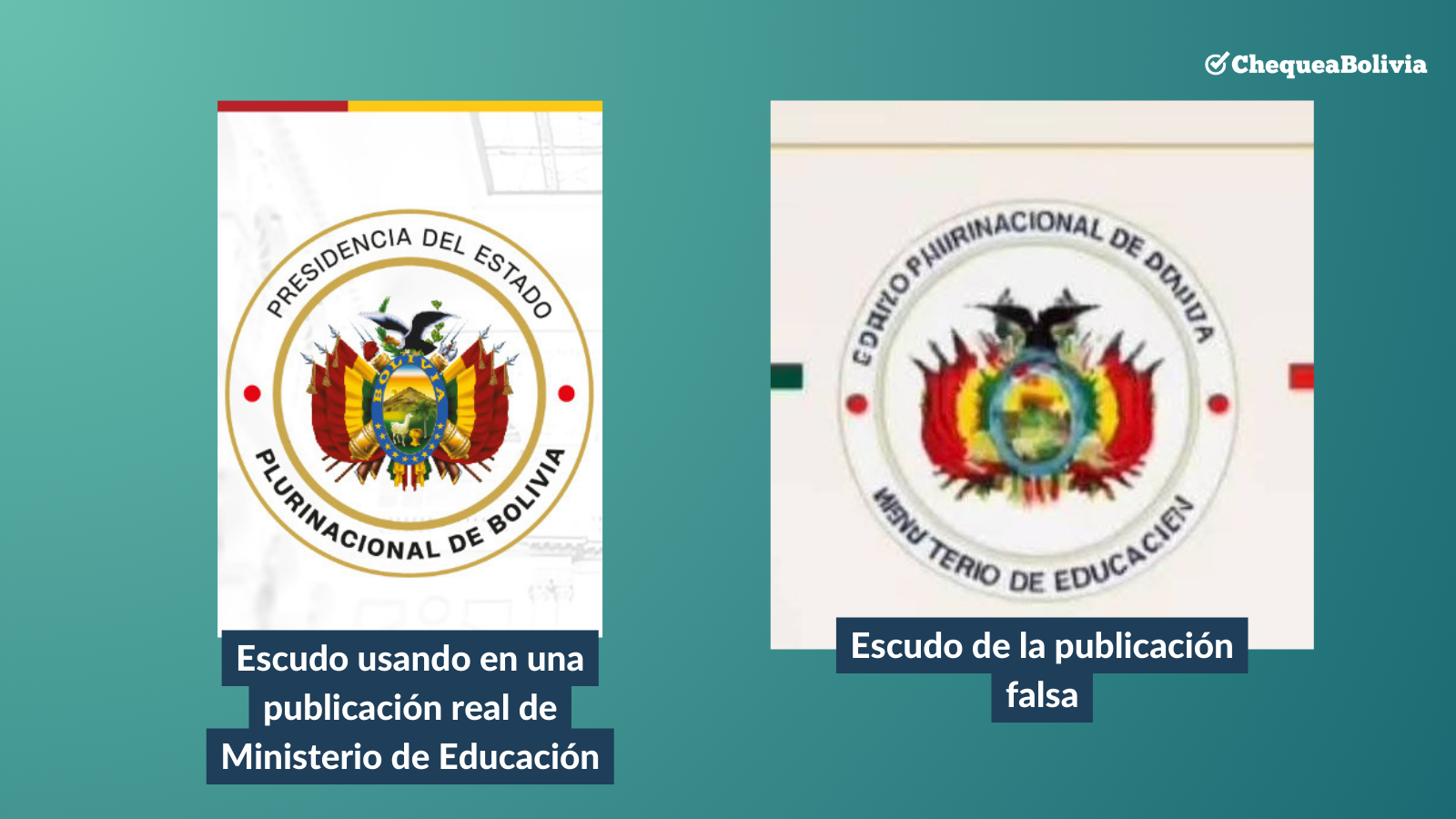 Al revisar los detalles de la imagen se observa que el escudo de Bolivia no coincide con el oficial. Además, las letras están distorsionadas; por ejemplo, en lugar de “educación” aparece escrito “educacien”.