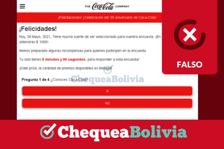 En redes sociales y grupos de WhatsApp circula una cadena con un link supuestamente de la Compañía Coca Cola, en la que ofrece mil dólares por ser seleccionado para participar en una encuesta. ChequeaBolivia advierte que se trata de un contenido falso.