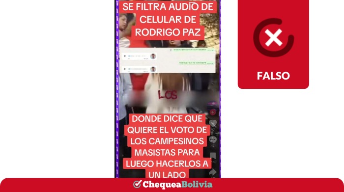 En redes sociales circula un audio atribuido al candidato presidencial del Partido Demócrata Cristiano (PDC), Rodrigo Paz, en el que supuestamente se lo escucha hablar a través de un audio de WhatsApp, señalando que “hará a un lado” a los “campesinos masistas”, una vez que voten por él. Chequea Bolivia evidenció que el audio es falso.