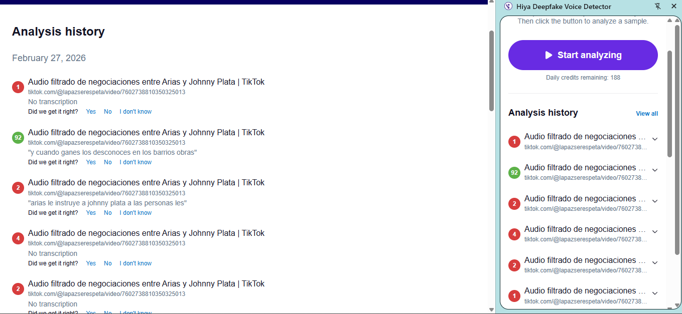 Resultados de la revisión con Hiya Deepfake Voice Detector.
