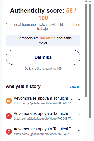 Se sometió el audio del video a la herramienta que detecta voces artificiales Hiya Deepfake Voice Detector. La mayor parte de los resultados indican que fue generado con inteligencia artificial.