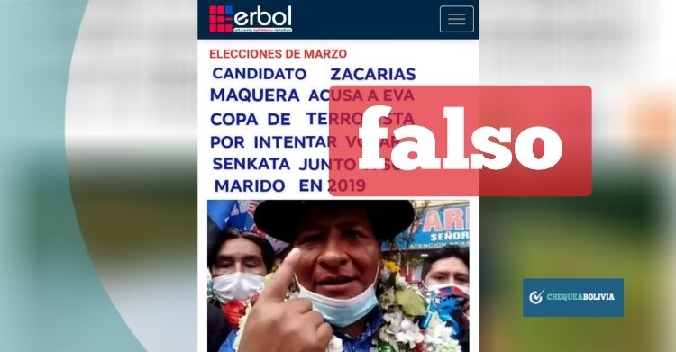 En Facebook circula una captura de una supuesta noticia de Erbol que indica que el candidato a la Alcaldía de El Alto por el Movimiento Al Socialismo (MAS), Zacarías Maquera, acusa a Eva Copa de “terrorista por intentar volar Senkata junto a su marido en 2019”. ChequeaBolivia verificó que se trata de un contenido falso.