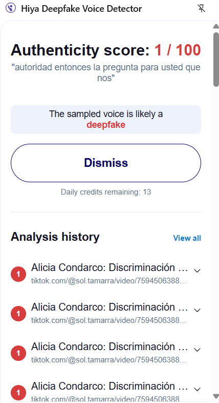 Se analizó el audio del video con la herramienta Hiya Deepfake Voice Detector, y los resultados indican que la voz es probablemente una deepfake, es decir, generada por inteligencia artificial, con la puntuación más alta de probabilidad.