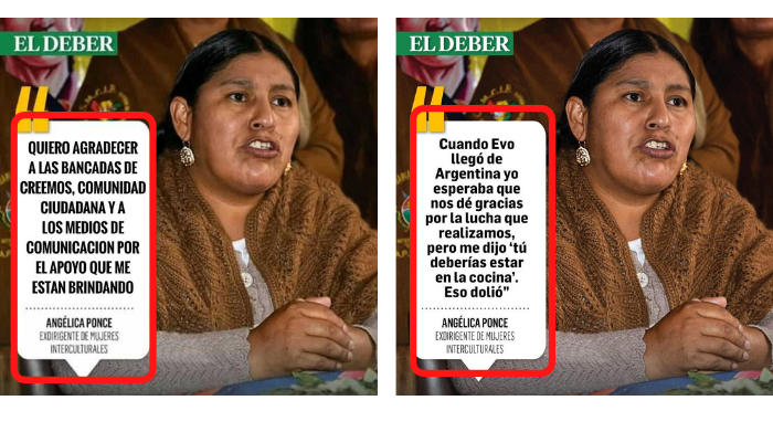 En Facebook circula una imagen con la línea gráfica de El Deber, en la que se le atribuye a la exdirigente de la Confederación Sindical de Mujeres Interculturales de Bolivia, Angélica Ponce, la siguiente declaración: “Quiero agradecer a las bancadas de Creemos, Comunidad Ciudadana y a los medios de comunicación por el apoyo que me están brindando”. ChequeaBolivia verificó que se trata de un contenido falso.
