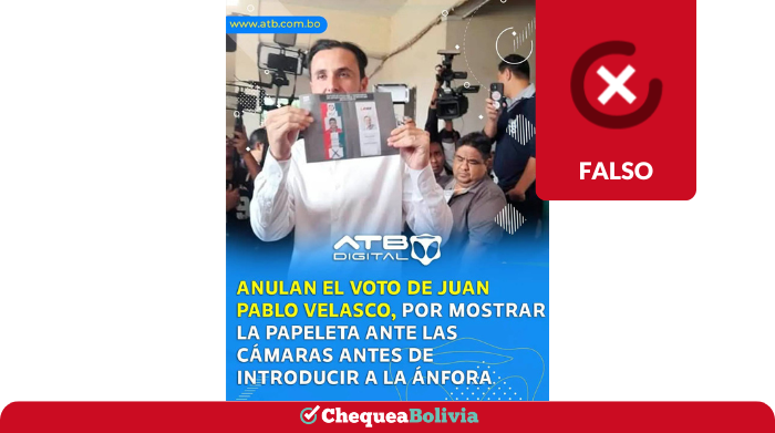 En TikTok circula una imagen con la línea gráfica de ATB Digital donde se afirma que el voto del candidato a la Vicepresidencia por Alianza Libre, Juan Pablo Velasco, fue anulado por mostrar su papeleta antes de introducirla al ánfora. En la imagen también se observa una papeleta marcada a favor del Partido Demócrata Cristiano (PDC). ChequeaBolivia verificó que el contenido es falso.