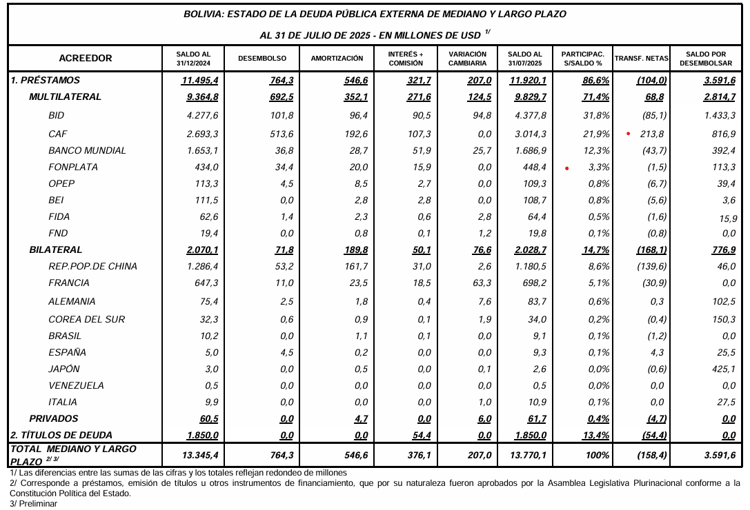 A julio de 2025, Bolivia tiene una deuda externa total de 13.770 millones de dólares.