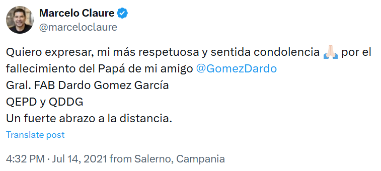 ChequeaBolivia encontró una publicación en X en el que Marcelo Claure se refirió a Gómez como su “amigo” tras el fallecimiento de su padre, en julio de 2021.