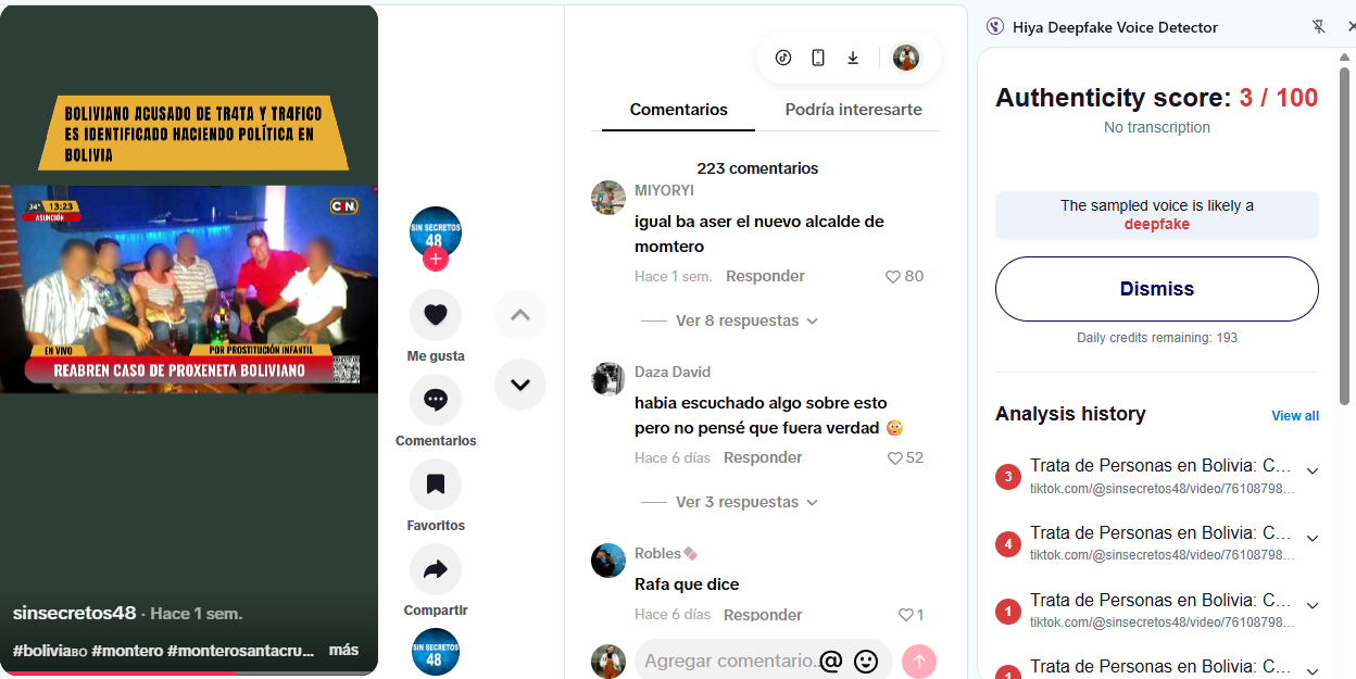 ChequeaBolivia sometió el audio a la herramienta Hiya Deepfake Voice Detector, que dio como resultado que el audio probablemente fue generado con inteligencia artificial dando como resultado entre 1 a 4 por ciento de autenticidad.