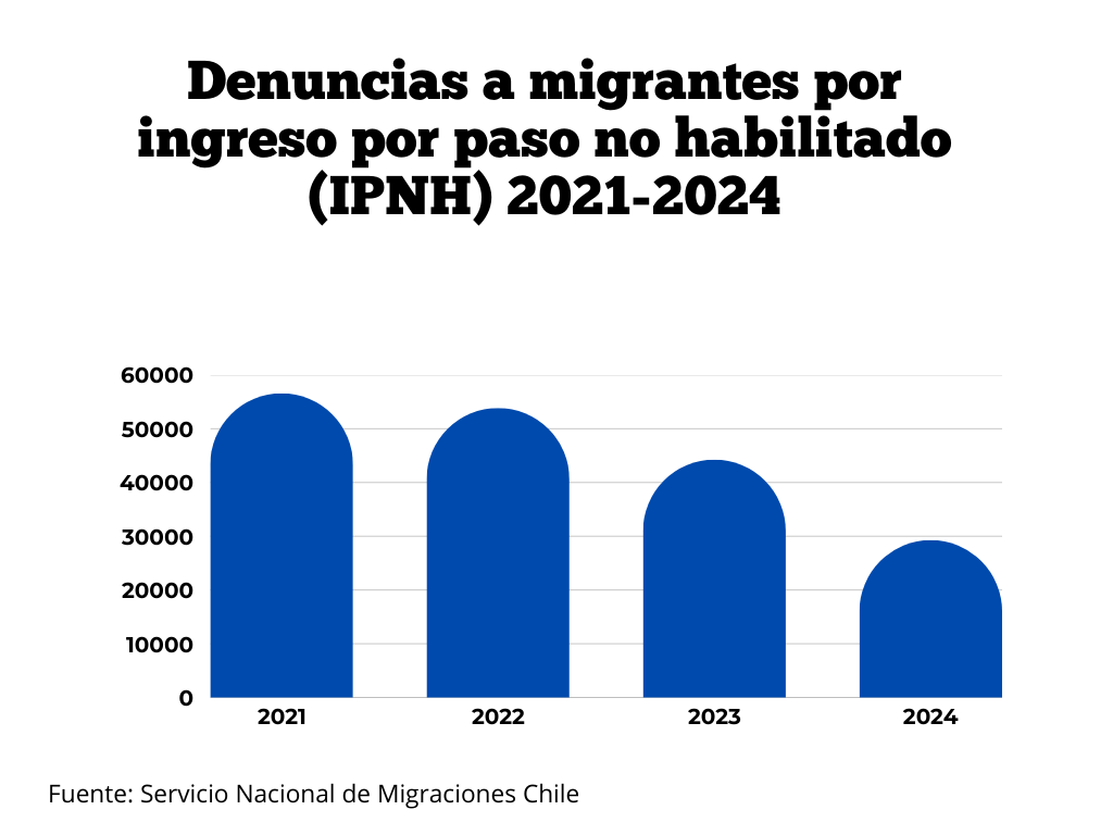 Si bien, según el Servicio Nacional de Migraciones, entre 2018 y 2024 hubo más de 251 mil denuncias a migrantes por ingreso por paso no habilitado (IPNH) en el norte de Chile, esta tendencia ha ido a la baja.