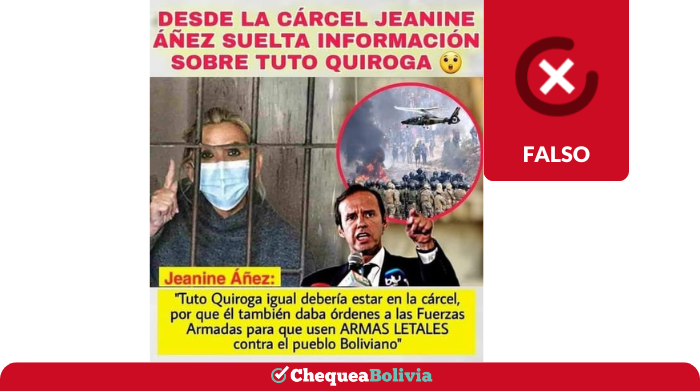 En Tiktok y Facebook circula una imagen que atribuye a Jeanine Áñez, expresidenta de Bolivia, la siguiente declaración: “Tuto Quiroga igual debería estar en la cárcel, porque él también daba órdenes a las Fuerzas Armadas para que usen armas letales contra el pueblo boliviano”. ChequeaBolivia verificó que el contenido es falso.