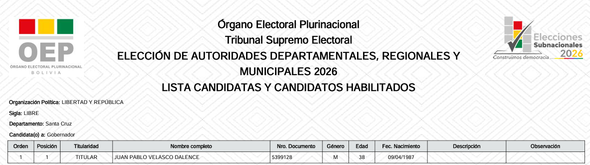 En una revisión de las listas de candidaturas inhabilitadas del Tribunal Supremo Electoral (TSE), se constató que no figura el candidato Juan Pablo Velasco. También se constató que no figura en la lista de candidaturas habilitadas por sustitución por renuncia y por sustitución por inhabilitación donde están los candidatos sustituidos y candidatos sustitutos.
