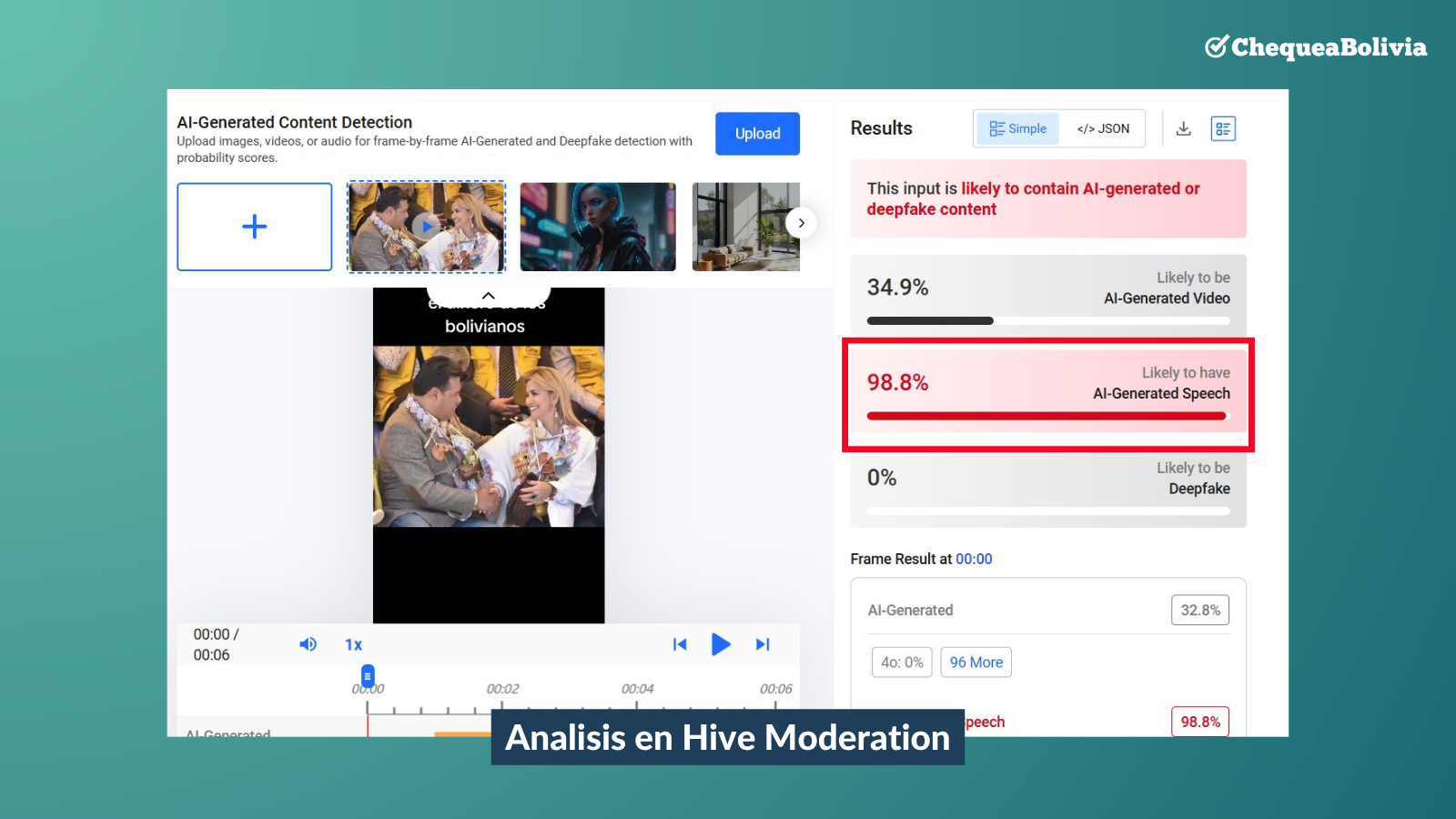 ChequeaBolivia descargó el video y lo pasó por la herramienta de detección de contenido generado con Inteligencia Artificial, Hive Moderation, dónde obtuvo más del 98 por ciento de probabilidad de que el video contenga audio creado con IA.