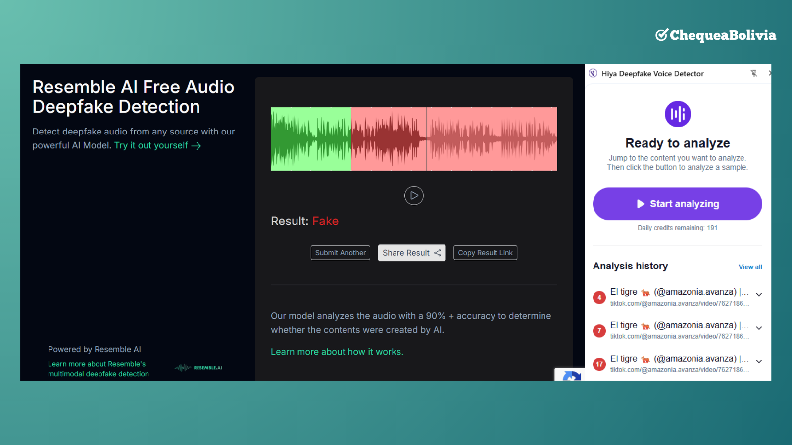 Capturas de los resultados obtenidos con Resemble AI y Hiya.