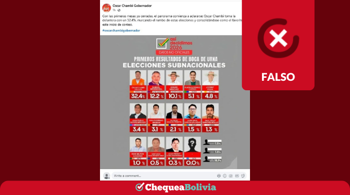 En Facebook circula una publicación que asegura que tras el cierre de las primeras mesas, Óscar Chambi, candidato para Gobernador de Oruro, lidera la votación con un 32 por ciento. ChequeaBolivia verificó que es falso.