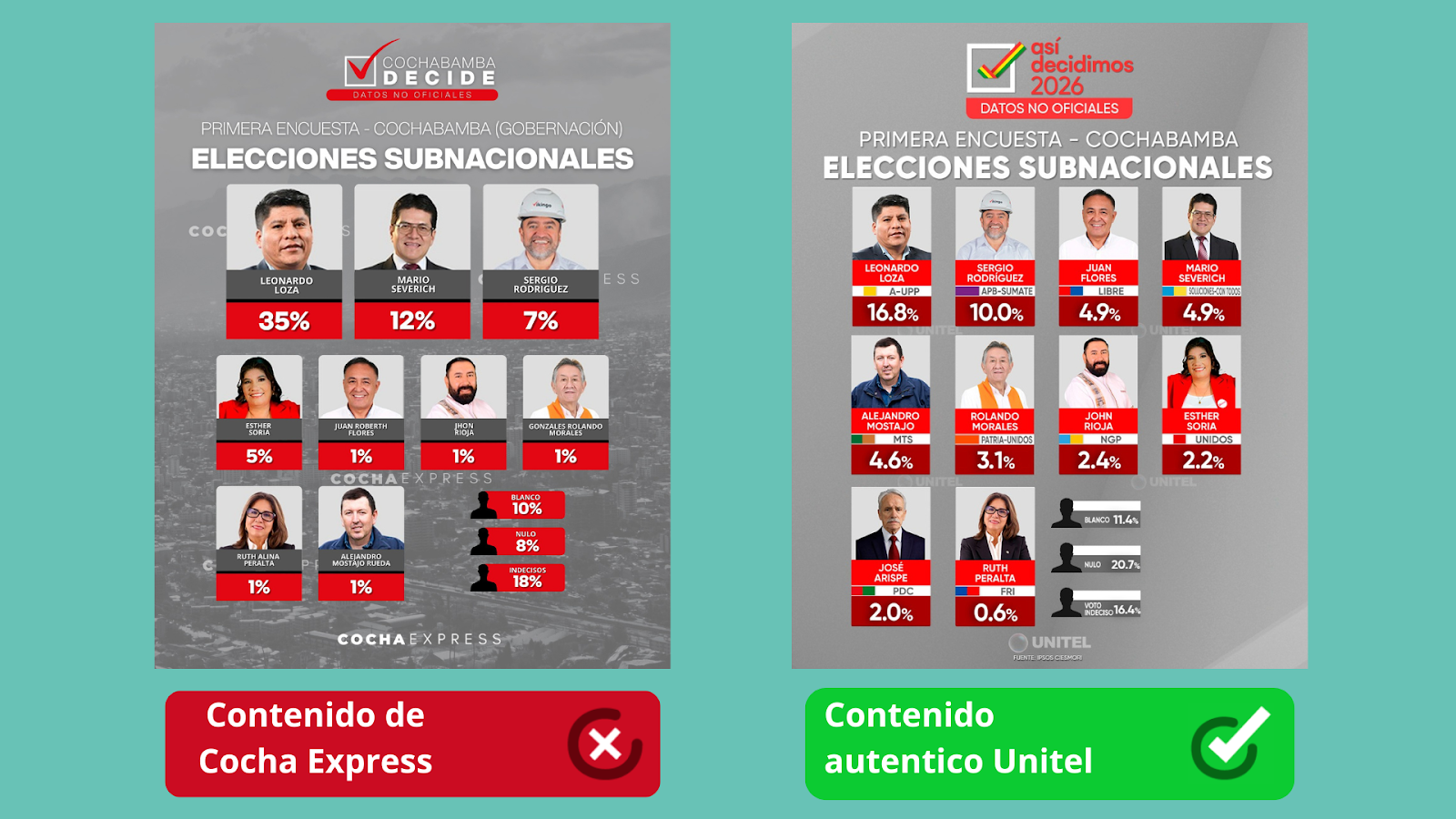 La publicación intenta imitar la línea gráfica de Unitel, medio que sí está habilitado. Al realizar una comparación entre una publicación original de Unitel con la encuesta falsa de “Cocha Express”, se encuentran diferencias visibles: En la parte superior de la imagen el logo de “Así decidimos 2026” y el tipo de letra utilizado es distinto.