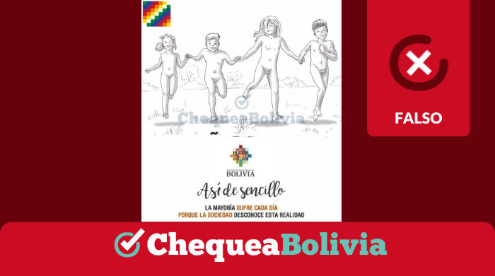 En Facebook (1,2) circula una imagen de unos niños desnudos, un logo del Estado Plurinacional de Bolivia y un mensaje que dice: “Así de sencillo. La mayoría sufre cada día porque la sociedad desconoce esta realidad”. En la descripción de la publicación se informa que se trata de la imagen publicitaria de los nuevos textos de la currícula “pervertida” que impulsa el Gobierno. ChequeaBolivia verificó que se trata de información falsa.