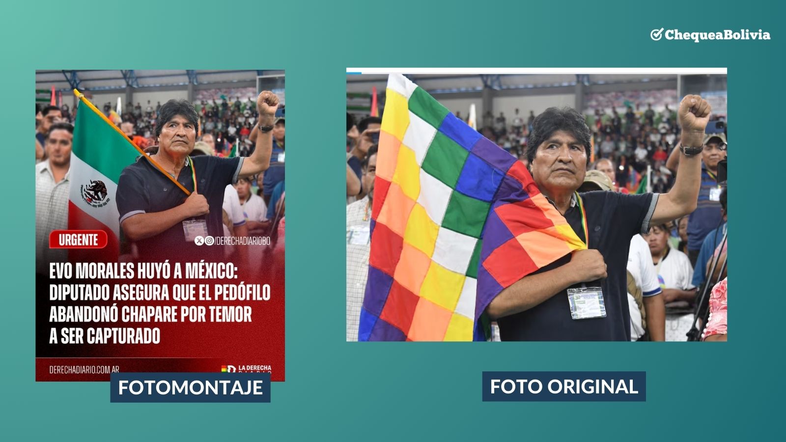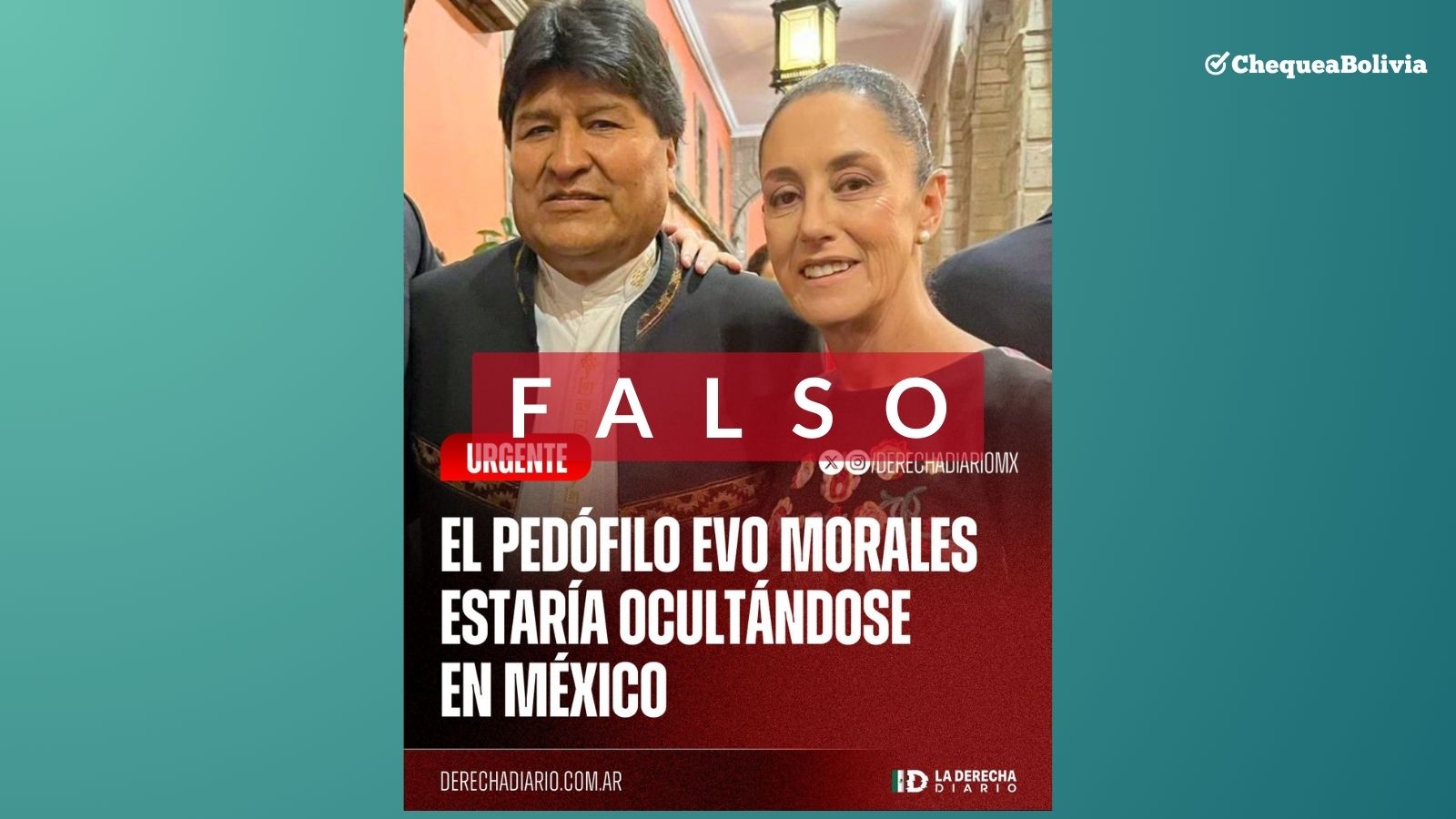 En X (antes Twitter) circulan fotos que muestran al expresidente Evo Morales junto a la presidenta de México, Claudia Sheinbaum, y otra en la que se ve a Morales con una bandera mexicana, sugiriendo que el exmandatario estaría en México (1 y 2). ChequeaBolivia verificó que es falso.