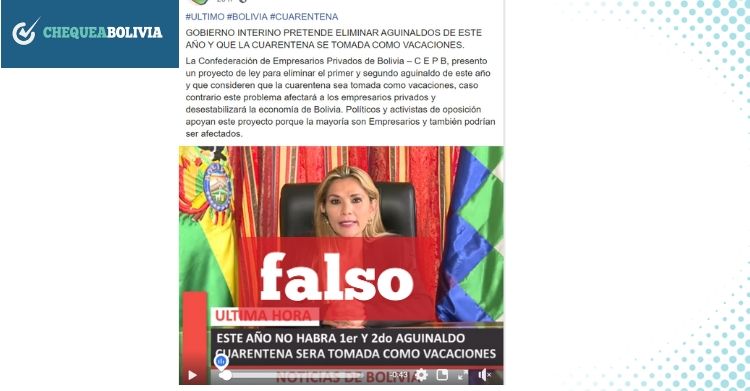 En redes sociales circula un video junto a un texto que señala que la Confederación de Empresarios Privados de Bolivia (CEPB) presentó un proyecto de ley en el que se pide eliminar el primer y segundo aguinaldo, además de que la cuarentena sea tomada como vacación. ChequeaBolivia verificó que la información es falsa.