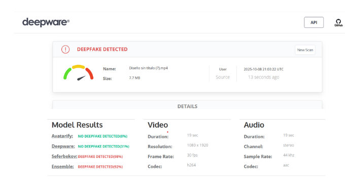 ChequeaBolivia revisó el audio con la herramienta Deepware, que calcula el porcentaje de posibilidad de que haya sido generado con Inteligencia Artificial (IA). El resultado fue un 92 por ciento de probabilidad de que haya sido creado con IA.