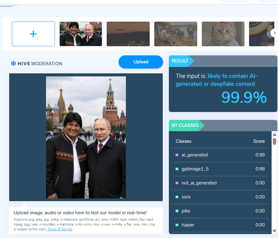 Se revisó este contenido con la herramienta Hive Moderation, misma califica que tiene un 99.9 % de probabilidades de haber sido generado artificialmente.
