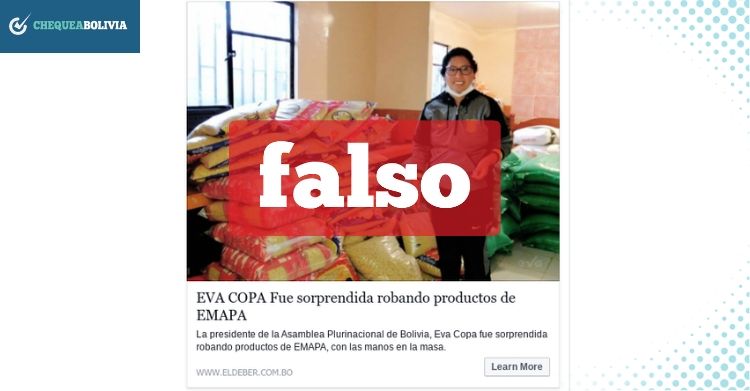 En redes sociales circula una imagen en la que se titula: “Eva Copa fue sorprendida robando productos de Emapa” como si fuera una publicación de El Deber. ChequeaBolivia verificó que el contenido es falso.