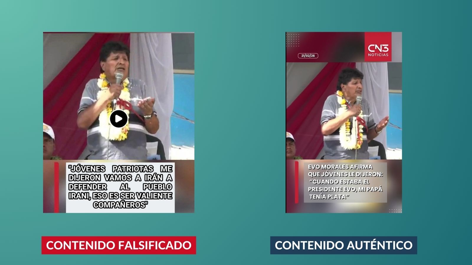En una búsqueda de la imagen, se identificó que la fotografía original que acompaña la supuesta declaración de Morales corresponde a videos del medio de comunicación CN3 Noticias (1,2), publicados el 21 de febrero de 2026.