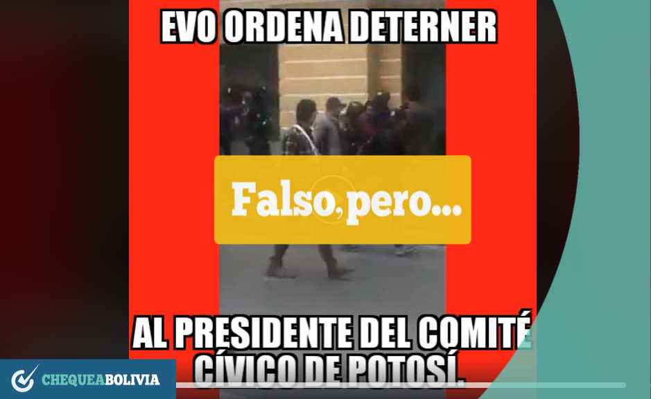 En redes sociales estuvo circulando un video en el que se afirma que Evo Morales ordenó detener al presidente del comité cívico de Potosí. ChequeaBolivia constató que la información es falsa, pero…