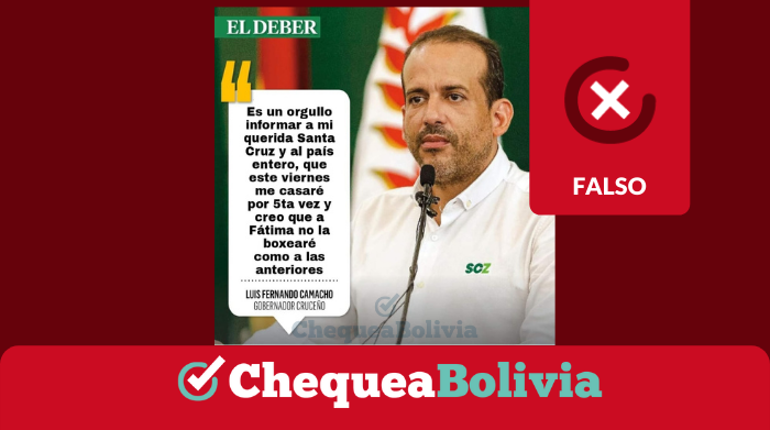 Usando la línea gráfica de El Deber en Facebook circula una imagen del gobernador cruceño, Luis Fernando Camacho, al que se le atribuye la siguiente declaración: “Es un orgullo informar a mi querida Santa Cruz y al país entero, que este viernes me casaré por 5ta vez y creo que a Fátima no la boxearé como a las anteriores”. ChequeaBolivia advierte que es información falsa.
