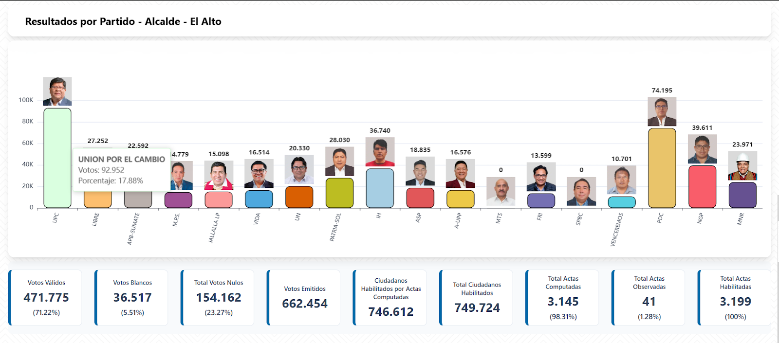 Según los resultados preliminares al 98.31 por ciento de actas computadas, el próximo alcalde de El Alto será Eliser Roca con un resultado de 17.88 por ciento.